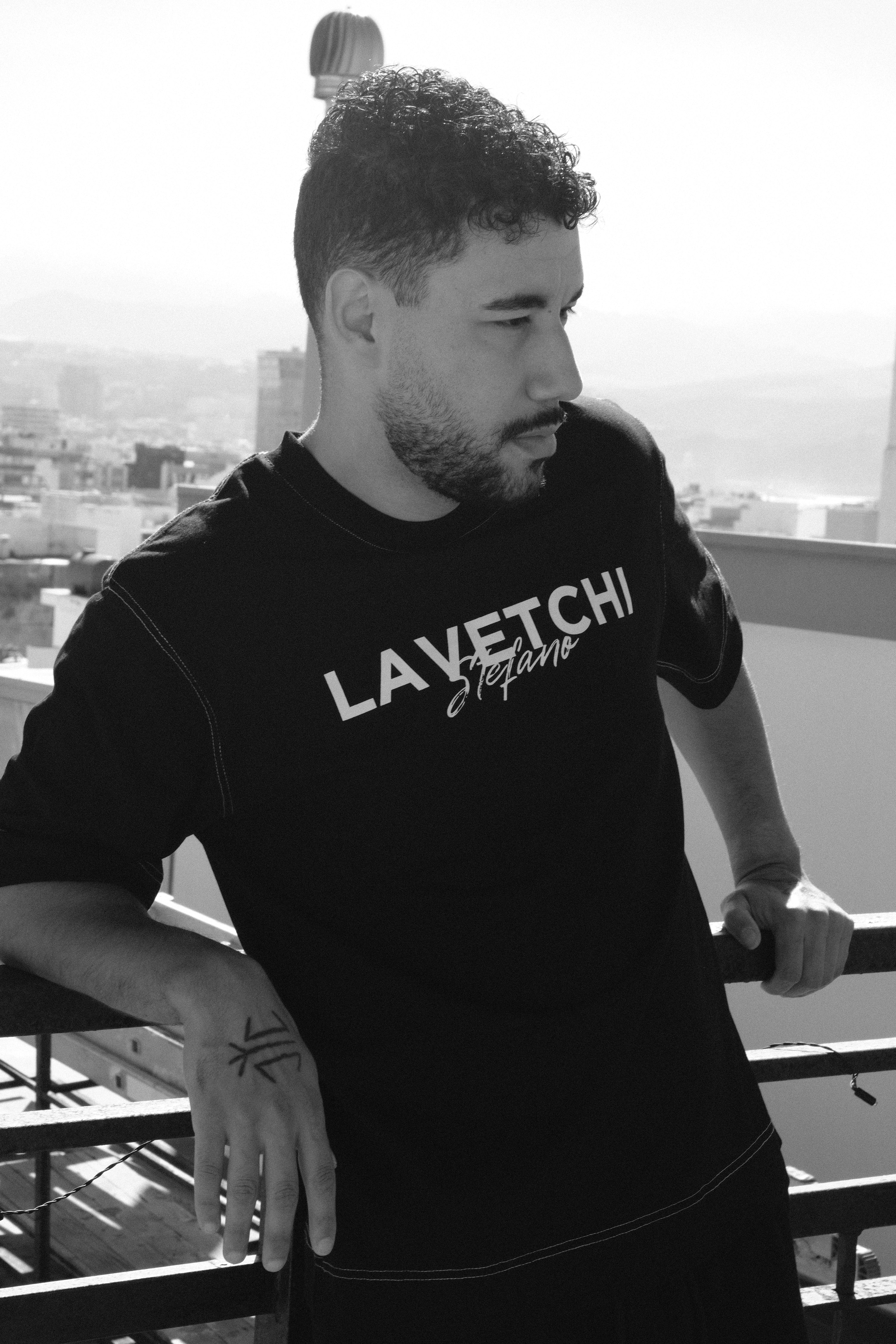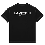 The white contrast stitching adds a subtle yet striking detail, reinforcing the garment’s artisanal craftsmanship. At the forefront, the signature ‘Lavetchi Stefano’ print stands bold in pristine white, a mark of exclusivity and status. This isn’t just a T-shirt—it’s a statement, a symbol of confidence, and a reflection of an uncompromising standard of excellence.